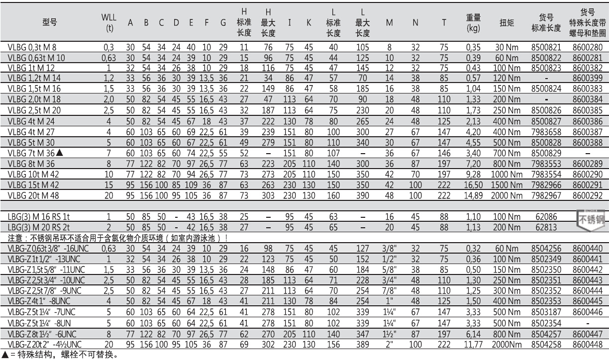 ·标有最小额定载荷,所有方向满载使用;可供标准公制螺纹(DIN EN 13)、公制细牙螺纹(DIN EN 13)、粗牙螺纹英制UNC(美制ANSI B1.1),细牙螺纹英制UNF(美制ANSI B1.1)